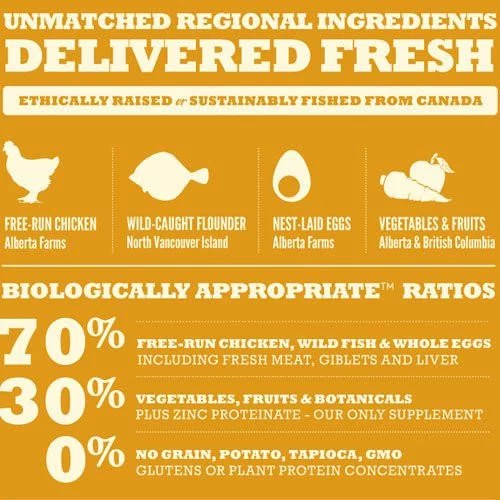 Acana Heritage Puppy & Junior De hond is geรซvolueerd als carnivoor met een natuurlijke behoefte aan voeding met gevarieerd vers vlees en verse vis aangevuld met kleine hoeveelheden groenten, fruit en grassen. Acana Heritage wordt voor het grootste deel gemaakt van voedingsstoffen die van nature aanwezig zijn in de ingrediรซnten; synthetische toevoegingen worden tot een minimum beperkt. Jonge honden hebben in hun groeiperiode behoefte aan een proteรฏnerijk dieet. Om deze reden bestaat Acana Heritage Puppy & Junior voor 70% uit ingrediรซnten die veel eiwit bevatten; scharrelkip, scharreleieren en in het wild gevangen platvis. Puppy & Junior is geschikt voor pups die tussen de negen en vijfentwintig kilo wegen als ze volgroeid zijn. Voor puppy’s van kleinere rassen is er Acana Puppy Small Breed Heritage, voor grotere rassen Acana Puppy Large Breed Heritage. Acana Acana maakt haar natuurlijke diervoeding van lokale producten. Hierbij wordt rekening gehouden met de evolutie van de hond; hun voeding bestond vroeger uit vers vlees en was rijk aan proteรฏne. De ingrediรซnten worden lokaal ingekocht (Alberta, Canada). Acana Biologically Appropriate wordt bereid met vers vlees, verse vis, groenten, fruit en kruiden afgestemd op de behoefte en levensfase van uw hond. Biologically Appropriateโข Biologically Appropriate diervoeding bestaat voor een groot deel uit verse ingrediรซnten. Een ander facet van Biologically Appropriate is dat de voeding is afgestemd op het verteringskanaal van het dier. De producten bevatten dan ook geen geur-, kleur- of smaakstoffen of andere toevoegingen en zijn GMO (Genetically Modified Organism) en antibiotica vrij. Voordelen Gemaakt met lokaal (Alberta, Canada) verkregen ingrediรซnten Rijk aan proteรฏne en vet Laag in koolhydraten (.
