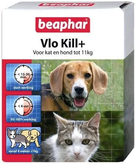 Beaphar Vlo Kill (tot 11 kg) kat en hond is een bestrijdingsmiddel tegen vlooien bij een vlooienbesmetting. Niet toedienen aan dieren jonger dan 4 weken of lichter dan 1 kg.