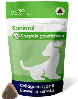 Sanimal Soepele GewrichtenSanimal Soepele Gewrichten helpt bij en voorkomt gewrichtsproblemen. Als gewrichtsproblemen optreden, dan verdwijnt kraakbeen in het gewricht sneller dan dat het wordt aangemaakt. Er ontstaat slijtage, hierdoor worden de gewrichten stijf en zal jouw hond minder makkelijk gaan bewegen. Sanimal Soepele Gewrichten heeft dezelfde samenstelling als Flexadin Advanced. * Voor alle honden vanaf 4 maanden oud die gewrichtsondersteuning kunnengebruiken * Ter ondersteuning van de gewrichten in het geval van (osteo)artritis * Bevat o.a. Ongedenatureerd Collageen type II en Boswellia seratta om jouwhond vitaal en gezond te houden * Voor alle honden vanaf 4 maanden oudGebruiksaanwijzingMet 1 brokje per dag is de handige hersluitbare verpakking voldoende voor 1 maand ondersteuning.Deze brokjes kun je eenvoudig toedienen: je geeft ze zo uit de hand, als een lekkere hondensnack! Dit kan op elk moment van de dag.Zorg daarbij altijd wel voor voldoende vers drinkwater en houd toezicht tijdens het eten.