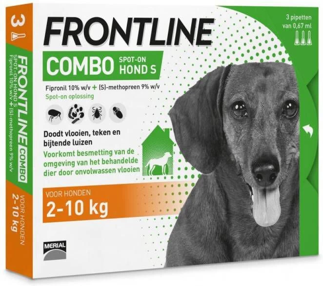 Frontline Combo Tegen Vlooien En TekenFrontline Combo heeft een 2-in-1 formule die zowel de levende parasieten als de eitjes aanpakt. Frontline Combo S is geschikt voor honden tussen de 2 en 10 kg. Frontline doodt vlooien binnen 24 uur en teken en luizen binnen 48 uur. Frontline Combo werkt tot 8 weken tegen vlooien en tot 4 weken tegen teken. * Snel en eenvoudig aan te brengen * Doodt vlooien, teken en bijtende luizen op jouw hond * Doodt vlooieneitjes en -larven in de directe omgeving van het behandelde dier * Doodt teken zodat deze geen bedreiging meer vormen voor jouw dier en de omgeving * Biedt metéén behandeling meerdere weken bescherming * Veilig te gebruiken bij zogende en drachtige dieren.