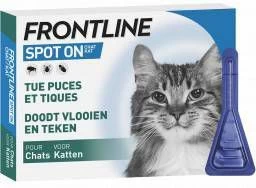 Frontline Spot On Voor KattenFrontline Spot on bevat 6 pipetten vloeistof voor toepassing op de huid van je kat. De Frontline vloeistof bestrijdt vlooien, teken en luizen bij katten. De werkingsduur tegen vlooien is 5 weken en tegen teken 4 weken. De vlooien worden binnen 24 uur na toedienen gedood, teken en luizen binnen 48 uur. * Bescherming van 5 weken tegen vlooien en 4 weken tegen teken * Bevat 6 pipetten * Vlooien sterven binnen 24 uur, teken en luizen gaan dood binnen 48 uur * Frontline bevat 50 mg fipronil per dier (1 pipet per dier)Let op: Niet gebruiken bij kittens die jonger zijn dan 8 weken of minder wegen dan 1kg. Niet gebruiken bij zieke of herstellende dieren. Niet gebruiken bij konijnen of andere dieren.