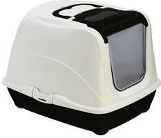 De Moderna Kattentoilet Flip Cat Zwart is een kattenbak met bovenstuk en een klep aan de voorkant. Inclusief kattenbakschepje.
