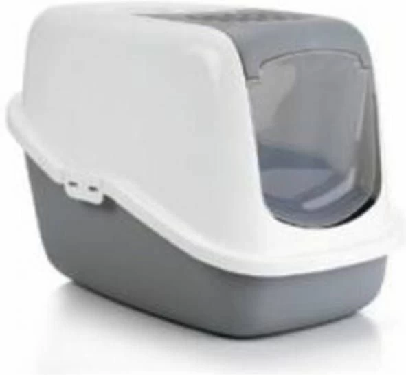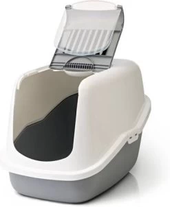 Nestor kattenbak grijs/witEen mooigevormde kattenbak in een modieuze kleurstelling. Doordat het deurtje samen met het binnenste gedeelte van de bovenzijde in een handomdraai los te klikken is hoeft u niet meer de complete bovenzijde van de onderbak.