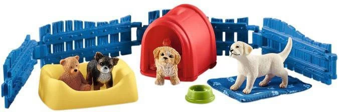 Inhoud: 3 honden puppy’s, 1 teddybeer, 4 hekdelen, 1 hondendeken, 1 hondenmand, 1 hondenkennel, 1 voerbak Scheidingsdelen kunnen naar believen worden ingeplugd en gecombineerd met andere Schleich-hekken! Dierfiguren niet individueel beschikbaar! In de puppykamer kan de moeder haar kleine puppy liefdevol en zorgzaam opvoeden. Om te zorgen dat de puppy’s niet weglopen is er een blauw hek geplaatst. Ook is er een speelveldje waar de puppy’s kunnen spelen. Na het spelen kunnen de puppy’s rustig uitrusten op het hondendeken, in de hondenmand of in de kennel. ‘S Avonds is er voldoende eten in de voerbak. Na het eten is de lange dag voorbij en moeten de kleintjes slapen. Als een van de pups niet zo goed kan slapen, helpt de kleine, knuffelige teddybeer hem in slaap.