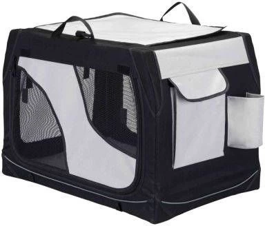 Trixie Reismand VarioDe Trixie Reismand Vario Zwart/Grijs 76x48x51 cm is een mobiele kennel voor de hond of kat van duurzaam polyester, ideaal als transportmand of als veilige plek op beurzen of visite.Deze lichtgewichte, polyester kennel neem je overal mee naartoe! Deze handige reismand van Trixie is gemaakt van een metalen frame met daaromheen duurzaam polyester. De mand is aan drie kanten te openen en voorzien van gaas-inzetten voor een goede ventilatie. Klittenband op de bodem van de kennel houdt hem goed op zijn plaats indien hij bijvoorbeeld meegaat in de auto. Ook is de reismand voorzien van lussen aan de onderkant, waardoor hij met haringen ook buiten in het park, op de camping of in de tuin te gebruiken is. De kennel heeft een zijvak en flessenhouder en komt met een losse bodem met schapenvacht-look! * Van duurzaam polyester * Zeer stevig door metalen frame * Aan drie kanten te openen * Met zijvak en fleshouder * Behaaglijke losse bodem met schapenvacht look.